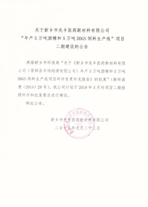 關(guān)于新鄉(xiāng)市先豐醫(yī)藥新材料有限公司“年產(chǎn)5萬(wàn)噸酒精和5萬(wàn)噸DDGS飼料生產(chǎn)線”項(xiàng)目二期建設(shè)公告